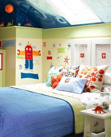 在國外人們追求的藍綠色自然色彩家庭裝修裝飾、別墅裝修裝飾等家裝中,并不一定是漫面的藍綠色,而是交相出現(xiàn)、左右或上下呼應(yīng)、藍色配以純凈的白色、鑲嵌碎花圖案、凸顯藍色窗簾,甚至?xí)O(shè)計藍天、白云、星星齊聚的吊頂,等等。以他們固有的意識、理念,盡情地打造著舒爽、清新的居室格調(diào)。尤其是在臥室中會肆意地應(yīng)用、集聚大自然元素,將銀河、太陽、星星、冰雪、野獸等集于一體,上演著既光怪陸離、又入情入理,神奇而充滿著夢幻的詭異事件。